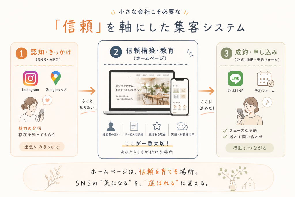 2. 【教育・信頼】HPで深める: SNSでは書ききれない「事業の理念」「詳細なサービス内容」「具体的な実績(お客様の声)」を体系的に伝え、不安を信頼に変える。
